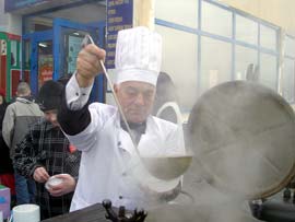 Burmistrz przy kotle ze wspaniałą grochówka.